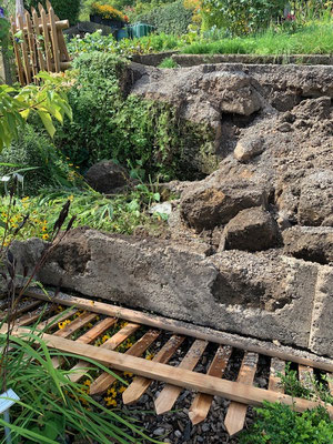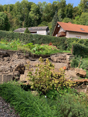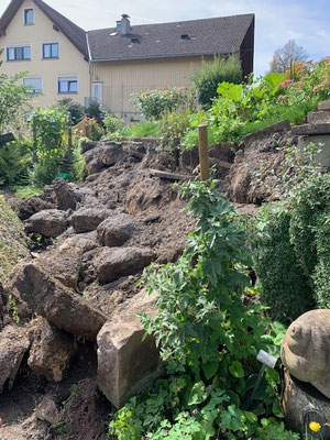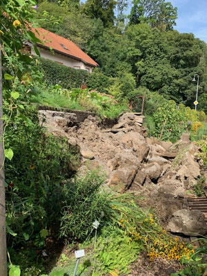 Leider sieht unser schöner Schürgarten gerade gar nicht mehr schön aus, sondern im hinteren Teil katastrophal. Nach einem Starkregen in der Nacht von Freitag, 5. September 2025, auf Samstag ist die Mauer zum Nachbargarten in den Schürgarten eingebrochen. Das vor kurzem neu angelegte Beet mit trockenresistenten Stauden wurde unter den Steinen begraben.